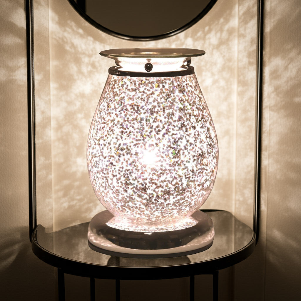 This beautiful burner features a dazzling glitter star design that reflects ambient light, creating a shimmering glow perfect for adding a touch of glamour to any room. Its electric operation provides a safe, flameless way to enjoy your favourite wax melts without the need for tealights.