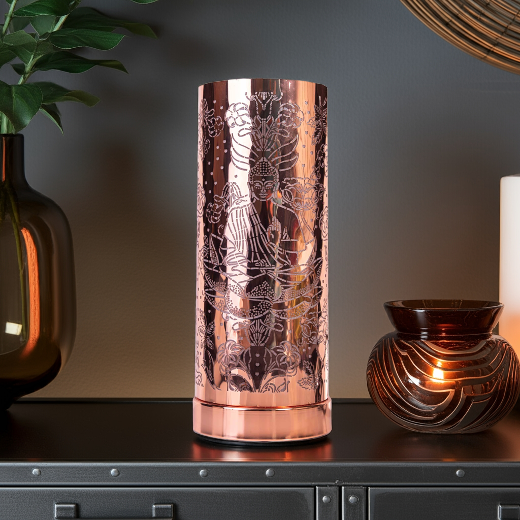 This exquisite electric burner features a sleek rose gold cylindrical design with a serene Buddha motif, adding a touch of luxury and calm to any room. Crafted to complement both modern and classic interiors, it’s perfect for creating a peaceful, scented ambiance.